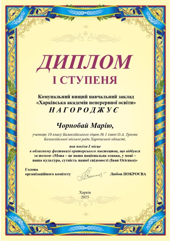 🎤 Балаклійську міську територіальну громаду гідно представила учениця 10 класу Балаклійського ліцею імені О.А. Тризни – Чорнобай Марія, яка продемонструвала силу українського слова, майстерність мовлення та глибоке усвідомлення його значення для кожного українця.