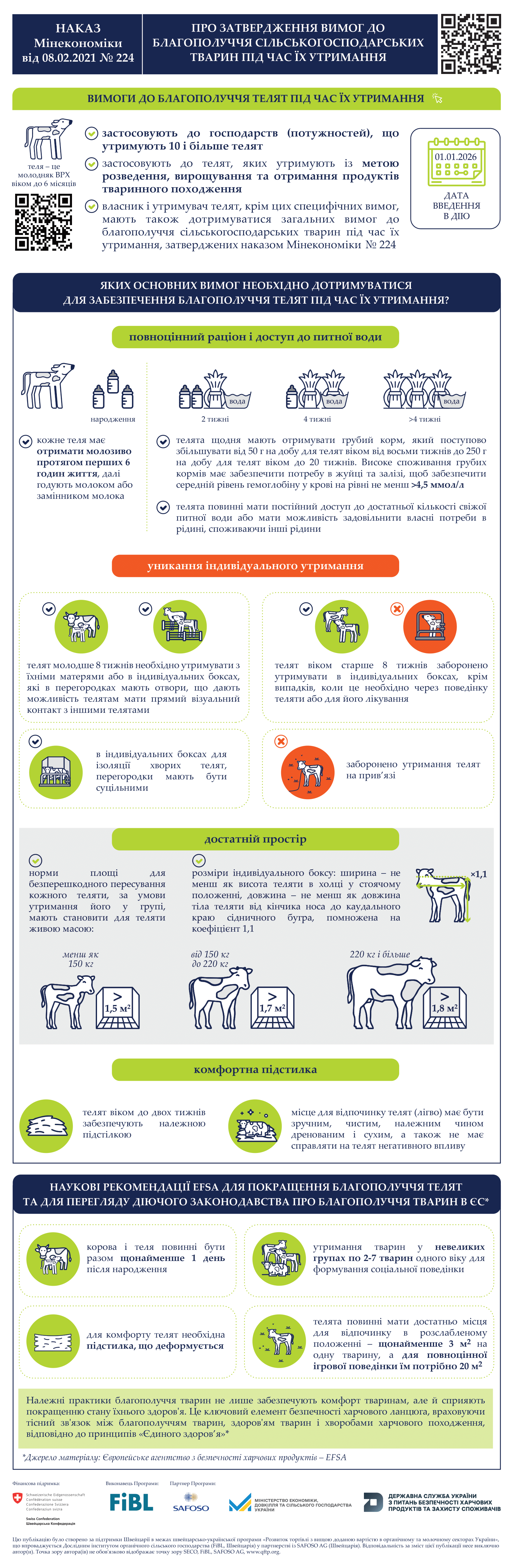 За підтримки Швейцарії, у межах швейцарсько-української програми «Розвиток торгівлі з вищою доданою вартістю в органічному та молочному секторах України» (Quality FOOD Trade Program), що впроваджується Дослідним інститутом органічного сільського господарства (FiBL, Швейцарія) у партнерстві з SAFOSO AG (Швейцарія), Міністерством економіки, довкілля та сільського господарства України та Держпродспоживслужби створено інфографіку, в якій висвітлені вимоги до благополуччя телят під час їх утримання.