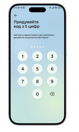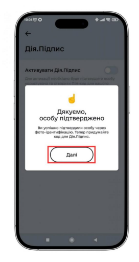 - Після здійснення цих кроків на екрані смартфона з’явиться запис про успішне підтвердження особи. Придумайте п’ятизначний код для Дія.Підпису (якщо раніше не створювався) та натисніть кнопку “Далі”.