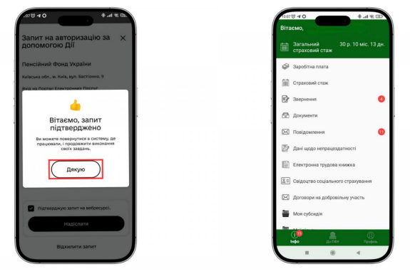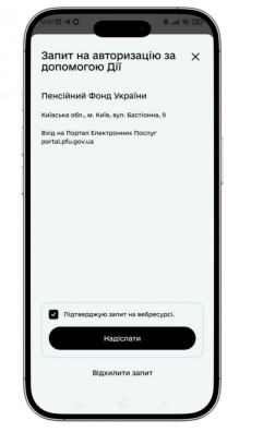 - Надішліть запит на авторизацію за допомогою Дії до Пенсійного фонду України та ще раз введіть свій п’ятизначний код.