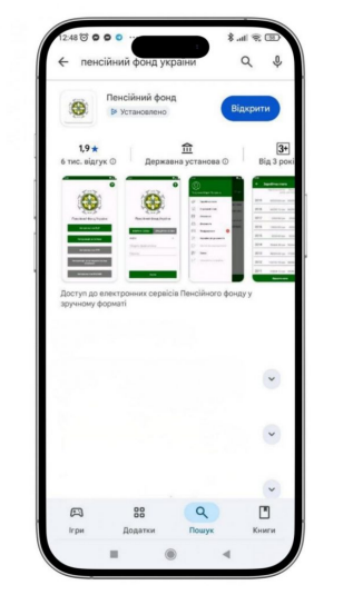 1. Насамперед, установіть застосунок “Пенсійний фонд України” на свій смартфон (або оновіть його, якщо застосунок вже встановлено).