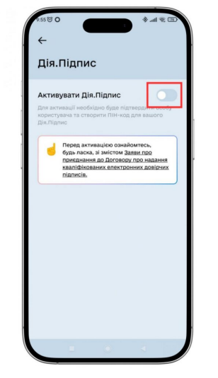 - Активуйте Дія.Підпис, перетягнувши бігунок праворуч (якщо не активовано раніше). Перед активацією варто ознайомитись зі змістом Заяви про приєднання до Договору про надання кваліфікованих електронних довірчих послуг.