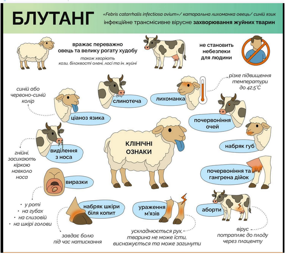 ‼️Важливо! У разі підозри захворювання тварини на блутанг одразу повідомте територіальний орган Держпродспоживслужби у вашому регіоні. ℹ️Довідково. Блутанг – це інфекційне вірусне захворювання жуйних тварини, переносниками якого є комахи роду Culicoides. Особливо сприйнятливі – вівці та велика рогата худоба