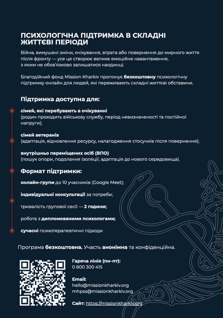 Опубліковано уКорисна інформація УСЗН ПСИХОЛОГІЧНА ПІДТРИМКА В СКЛАДНІ ЖИТТЄВІ ПЕРІОДИ 24.03.2026 Навігація по запису Попередній запис Національна стратегія доходів до 2030 року: ключові завданняНаступний записОголошення про початок формування конкурсної комісії для проведення конкурсного відбору незалежних членів наглядової ради комунального некомерційного підприємства Балаклійської міської ради Харківської області «Балаклійська клінічна багатопрофільна лікарня інтенсивного лікування»